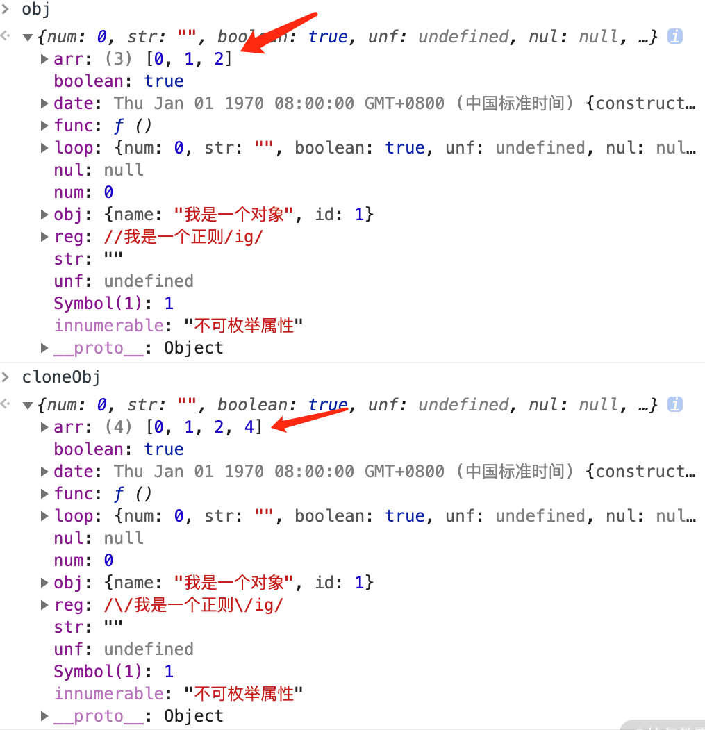 我们看一下结果,cloneObj 在 obj 的基础上进行了一次深拷贝,cloneObj 里的 arr 数组进行了修改,并未影响到 obj.arr 的变化,如下图所示。